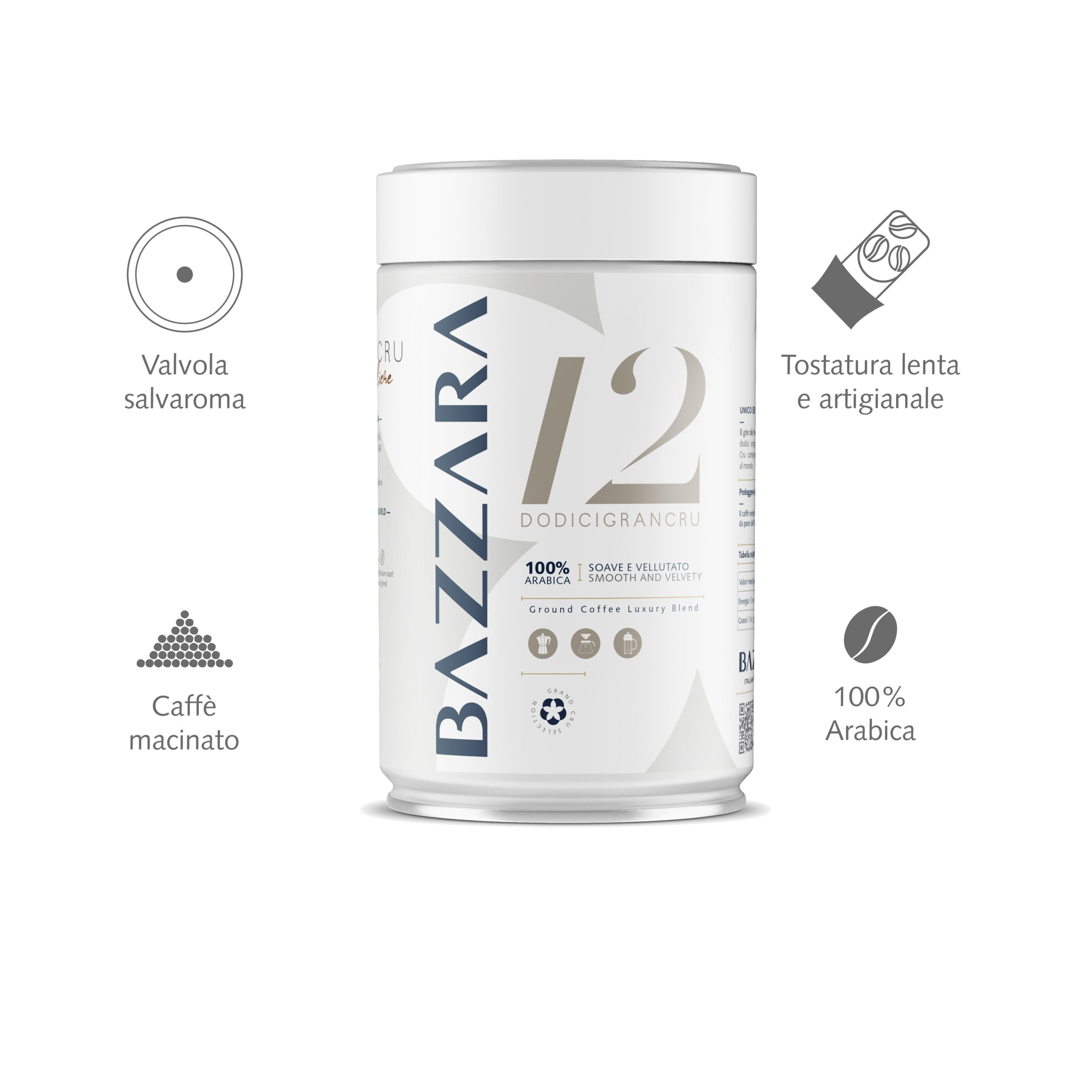 Dall’unione di dodici origini di altissima qualità, tra cui il Jamaica Blue Mountain e il Colombia Supremo, nasce la Blend 100% Arabica “DODICIGRANCRU”. Disponibile anche nel formato in 250g macinato medio-fine, è l’ideale per chi vuole provarlo nelle preparazioni Moka, Filtro e French Press.