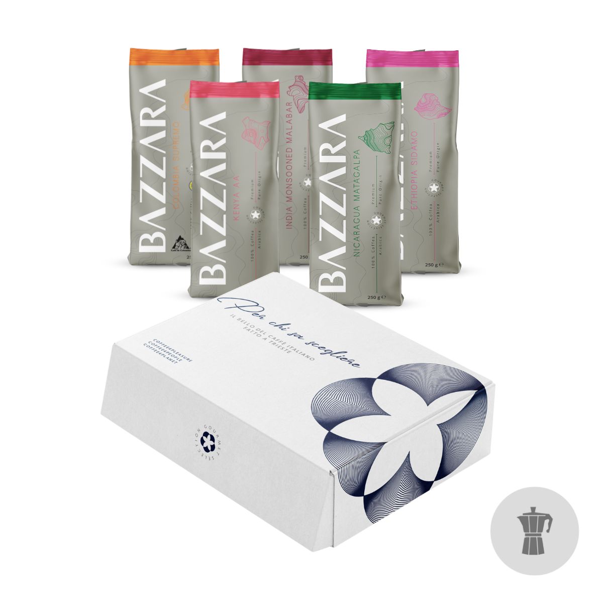 Dal Sud America, passando per il continente africano e approdando in Asia, crea il tuo cofanetto selezionando 5 caffè tra le 11 monorigini 100% Premium Arabica firmate Bazzara.